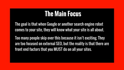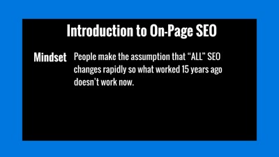 If you've ever wondered what could be holding you back from implementing basic on-page search engine optimization, it's often because of your mindset. So, in this video we're going to talk about how to get into the right mindset. You're also going to get a quick overview of what's inside of the video course so you know exactly what to expect. Plus, you’ll be given a list of things you’ll need to get started.