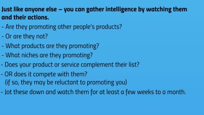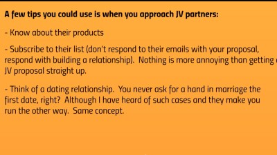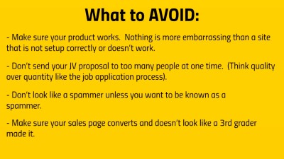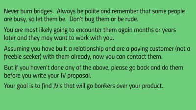 Before you approach JV partners, you should think about this one. I can’t tell you how many people do it wrong and just shine a negative light on themselves for years to come. Many JV partners have groups of people they hang out with. If you do it right, their group will want to promote for you, especially if one person has a profitable experience. Do it wrong and you may as well say goodbye forever.