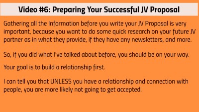 Gathering all the information before you write your JV Proposal is very important, because you want to do some quick research on your future JV partner such as what they provide. By doing it right, you begin to establish a relationship with them.
