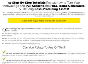 30 Step-By-Step Tutorials Reveal How to Turn Your Knowledge and PLR Content into FREE Traffic Generators & LifeLong Cash-Producing Assets! Got a ton of private label content sitting on your hard drive doing nothing?... Perhaps you have specialize knowledge on a particular topic?... Finally put all that information to good use and turn them into attractive content that generates FREE traffic and income streams!