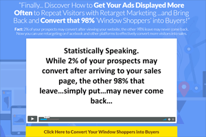 “Finally... Discover How to Get Your Ads Displayed More Often to Repeat Visitors with Retarget Marketing ...and Bring Back and Convert that 98% ‘Window Shoppers’ into Buyers!” Fact: 2% of your prospects may convert after viewing your website, the other 98% leave may never come back. Now you can use retargeting on Facebook and other platforms to effectively convert more visitors into sales. With such a high percentage of people leaving your site, each with their own reasoning, is there any way to get them back without reinvesting more money into new clients?... The answer is YES!