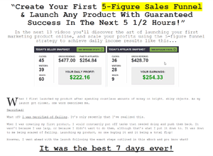 “Create Your First 5-Figure Sales Funnel & Launch Any Product With Guaranteed Success In The Next 5 1/2 Hours!” In the next 13 videos you'll discover the art of launching your first marketing product online, and scale your profits using the 5-figure funnel strategy to achieve daily income results like this...