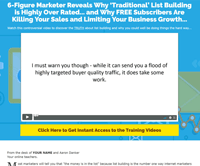 6-Figure Marketer Reveals Why ‘Traditional’ List Building is Highly Over Rated... and Why FREE Subscribers Are Killing Your Sales and Limiting Your Business Growth... Watch this controversial video to discover the TRUTH about list building and why you could well be doing things the hard way... Quality over Quantity - You don't need to build a huge list but a small list that's more focused and a higher quality. You will also save on your autoresponder fees because the bigger your list gets, the more you have to pay on your monthly charges.