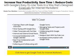 Increase Your Productivity, Save Time & Reduce Costs with Google's Easy-To-Use Tools In a Way that's Designed Especially for Internet Marketers! Master Your Workflow, Collaborate Accurately With Your Team and Make The Most of Google's Productivity Tools to Streamline Your Business & Organize Your Life!