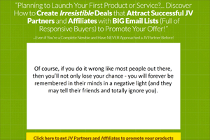 Are You Planning to Launch Your First Product or Service?... “Discover How to Create Irresistible Deals that Attract Successful JV Partners and Affiliates with BIG Email Lists (Full of Responsive Buyers) to Promote Your Offer!” ...Even if You're a Complete Newbie and Have NEVER Approached a JV Partner Before! In this video course, you will learn what you need to get started, how to find joint venture partners, approach them, and become a JV magnet. Remember, while everyone is too busy spamming them, you’re doing it professionally. You’re doing it smart.