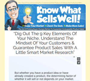 “Dig Out The 9 Key Elements Of Your Niche, Understand The Mindset Of Your Customers & Guarantee Product Sales With A Little Smart Market Research” It's one thing to KNOW that you need to conduct as much research about your markets as possible. However actually DOING it and applying the knowledge is another thing altogether. 'Know What Sells' simplifies the important questions so you can apply them effectively in your business. The end result are winning products that are guaranteed to sell again and again!