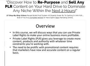 “Discover How to Re-Purpose and Sell Any PLR Content on Your Hard Drive to Dominate Any Niche Within the Next 2 Hours!” 27 Step-By-Step Videos Reveal Bullet Proof System All Experts Swear By To Cashing In With PLR... Even If You're A Complete Newbie Or Have Spent Years Marketing Online. One of the biggest problems people face with PLR products is selling it 'as is'. If you're just the same as 1000's of other people out there that are doing the same thing, then your sales will be few and far between.