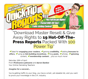 “Download Master Resell & Give Away Rights to 19 Hot-Off-The-Press Reports Packed With 100 Power Tip” Ideal for engaging your readers, gaining credibility, adding bonuses to offers, using as list-building incentives, blog posts, articles, spinning content, membership content ...plus so much more! Quick Tip Reports is your secret weapon to provide quality content to your readers INSTANTLY!