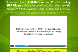 “Discover How to Rebrand and Profit from Any PLR Video and Create a Profit-Pulling Sales Machine with just a Few Simple Tweaks... in as Little as 60 Minutes...” Finally Create Your Own Unique High-Converting Products that Out-Sells and Outperforms Similar Products in the Marketplace... whilst Making You Look like an Online Marketing Guru! But if you're one of the smart 1% you'll know that you have to do something different... “So what exactly do you need to do?...” The answer is simple. You need to REBRAND your PLR videos!