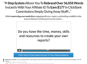 “9-Step System Allows You To Rebrand Over 56,058 Words Instantly With Your Affiliate ID To Earn $177 In ClickBank Commissions Simply Giving Away Stuff!...” Whilst maximizing your email clicks, engaging with your readers, and building credibility in the process! Read on to find exact how this works!.... Report Fortunes is your SECRET Weapon to Provide Quality Content to Your Readers INSTANTLY... Whilst Banking BIG ClickBank Commissions In The Process!