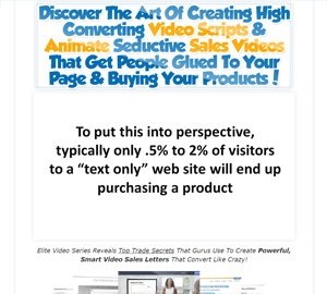 Elite Video Series Reveals Top Trade Secrets That Gurus Use To Create Powerful, Smart Video Sales Letters That Convert Like Crazy! Let's face it. If you're not using videos in your online marketing then you're seriously missing out on a lot of sales, leads and even free traffic. Video sales letters often convert several times better than standard sales letters, even if you use the same basic sales copy and techniques!