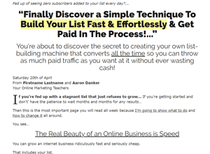“Finally Discover a Simple Technique To Build Your List Fast & Effortlessly & Get Paid In The Process!...” You're about to discover the secret to creating your own list-building machine that converts all the time so you can throw as much paid traffic as you want at it without ever wasting cash! If you’re fed up with a stagnant list that just refuses to grow... If you’re getting started and don't have the patience to wait months and months for any results then this is the most important page you will read...