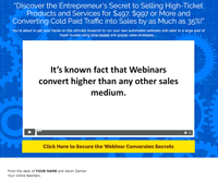 “Discover the Entrepreneur's Secret to Selling High-Ticket Products and Services for $497, $997 or More and Converting Cold Paid Traffic into Sales by as Much as 35%!” You're about to get your hands on the ultimate blueprint to run your own automated webinars and cater to a large pool of hyper buyers using time-tested and proven sales strategies... Webinars can mean the big break you've been looking for in your career as an infopreneur regardless of any kind. This is the ultimate decision maker that will mean adding an extra 1 or 2 digits on top of what you're currently making right now! And the best part is... creating your own highly successful webinars is a LEARNABLE skill.