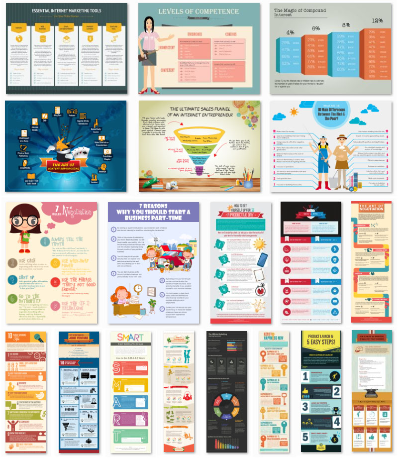 These are high quality informative graphics that will add value to your business. Take any of one of them, brand them with your link and logo, make them your own and you'll get fresh free traffic and higher conversions in no time!