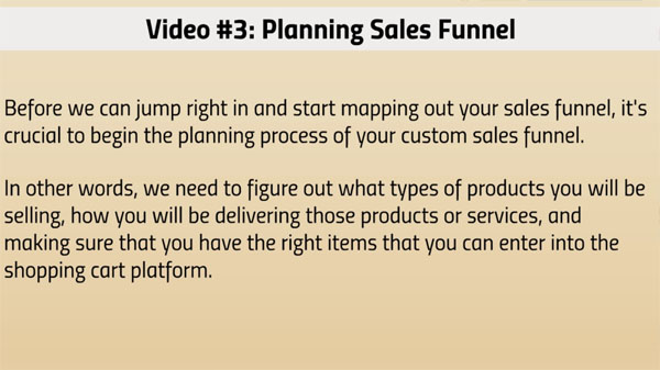 Before we can jump in and start mapping out your sales funnel, it's crucial to begin the planning process of your custom sales funnel. We'll brainstorm what types of products you will be selling, how you will be delivering those products or services, and making sure that you have the right items that you can enter into the shopping cart platform. This part of the process is crucial to the success of your sales funnel and where 95% of beginners fail.